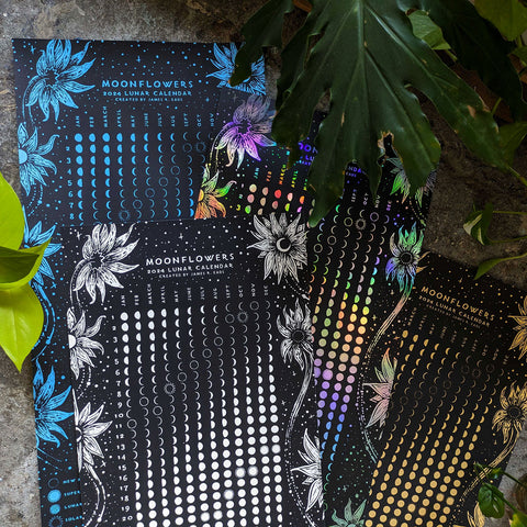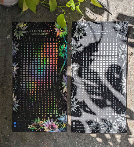 The Moonflowers 2025 Lunar Calendar is a 12" x 24" screenprint on either rainbow foil paper or matte white paper. This calendar includes the lunar phases for the entire year as well as Super Moons, Lunar Eclipses, and Solar Eclipses.